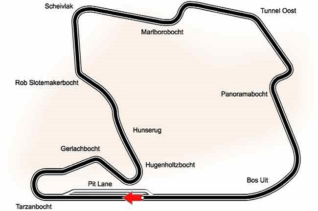 This is a map of the Zandvoort circuit, showing the circuit configuration as it existed in 1980. Since then, the layout has changed